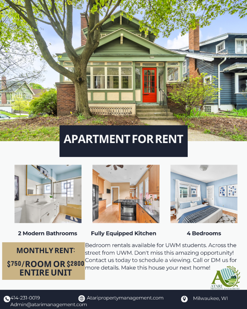 Kenwood Estate in Milwaukee offers private room and bedroom rentals ideal for students, located directly across the street from the University of Wisconsin–Milwaukee. Units include a full kitchen and laundry hookups for convenience. The property is close to schools and shopping centers, and room rentals are available specifically for students, providing an accessible option for those attending UWM.